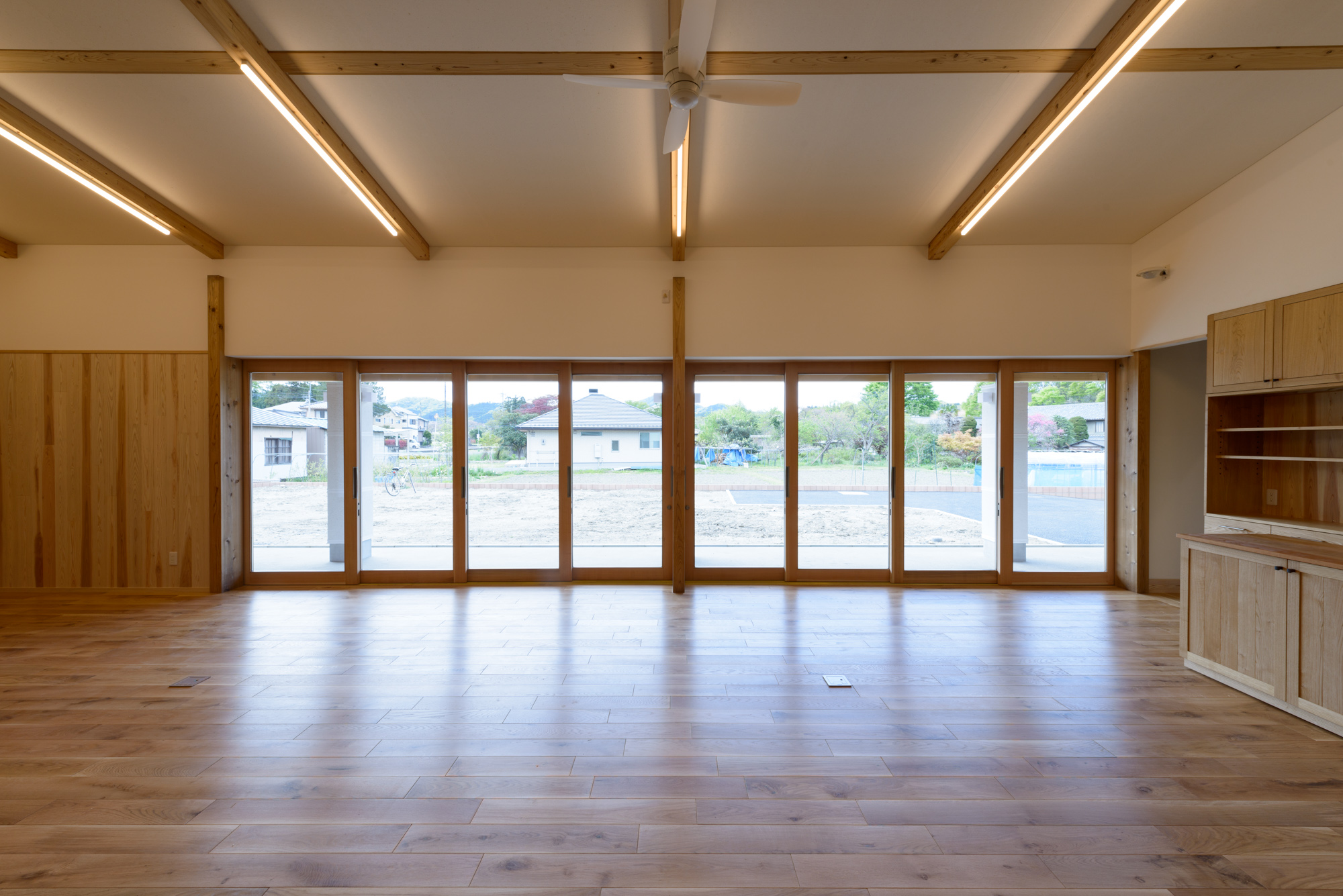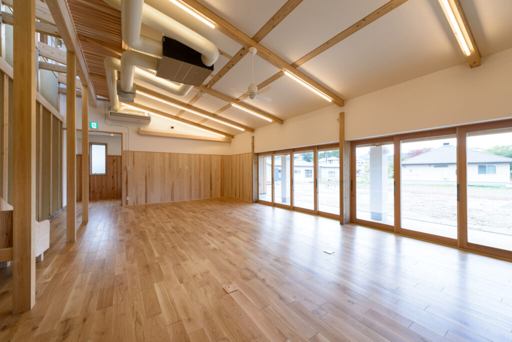 屋外空間とつながる大開口で大地の再生手法で整えた「庭」とつながります。