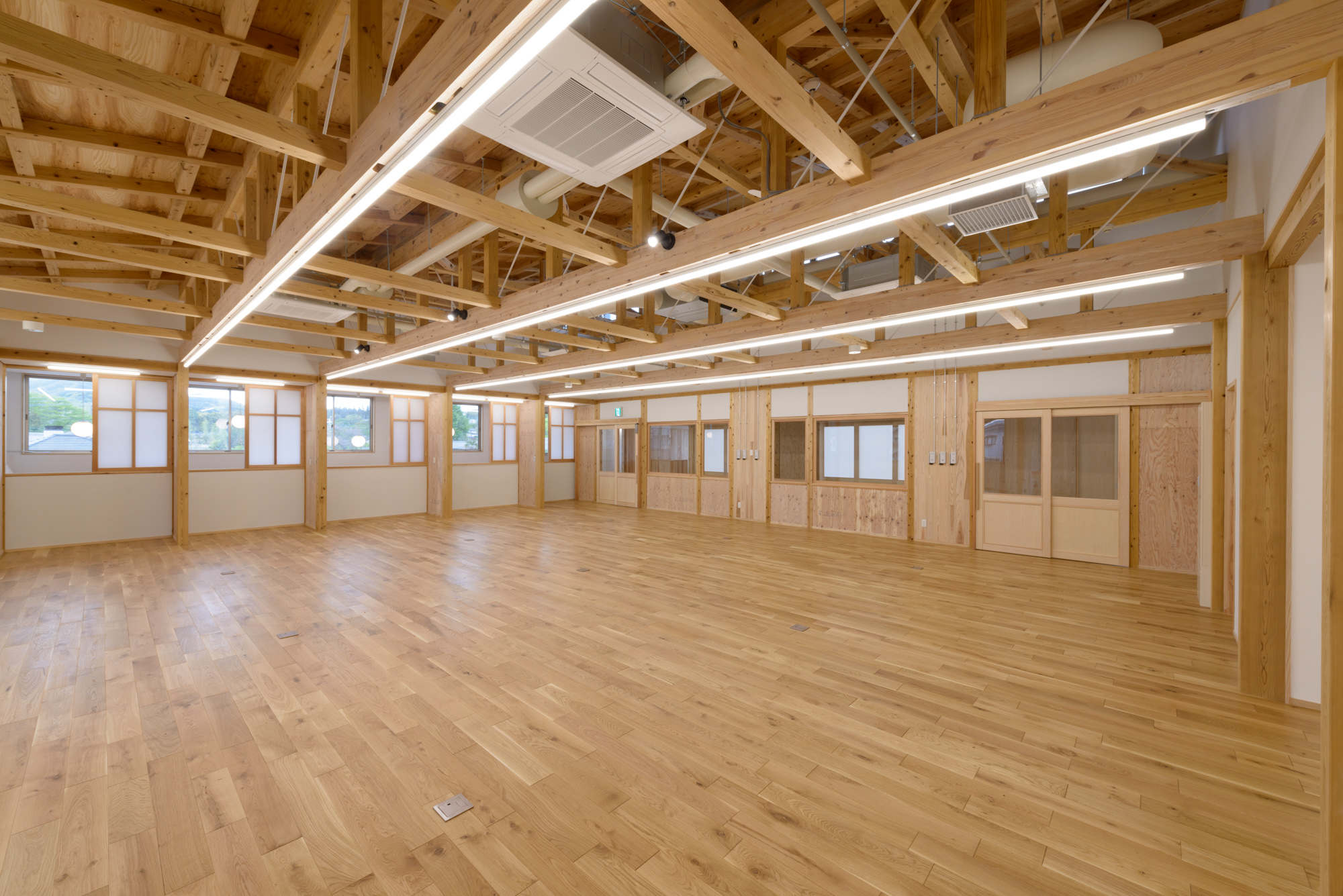 構造的には15mの空間を木製トラス梁で形成し、そのまま室内に表しにしているのが特徴です。