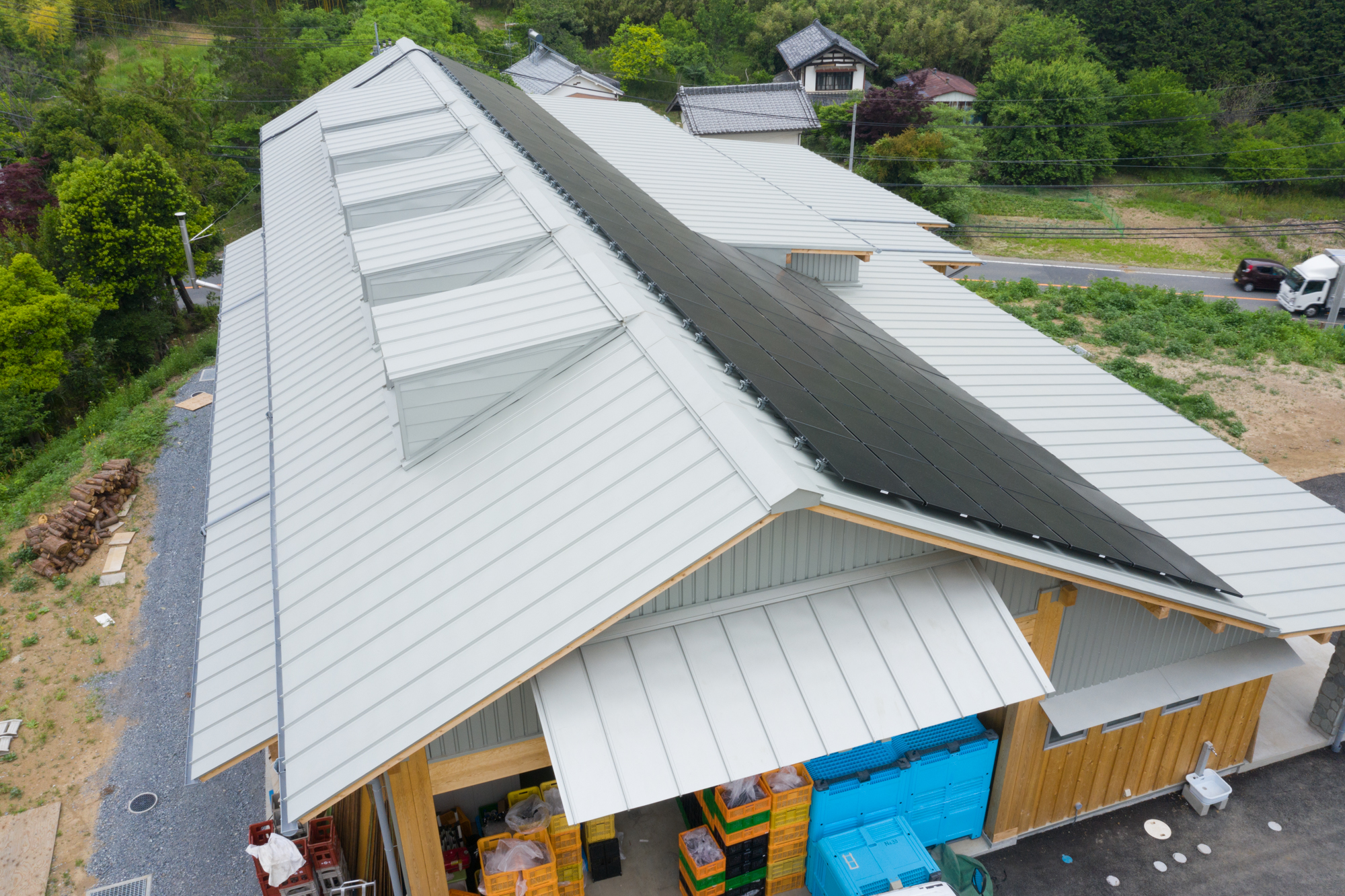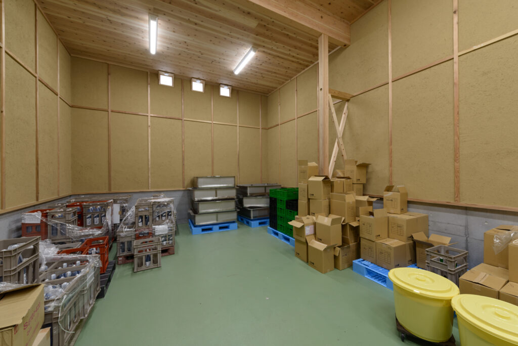 | 仕様 | 在来木造「山形トラス」 断熱仕様:ウール断熱 貯蔵所:年間13度に維持「エアコン使用」 作業は外気にオープンな環境で行い、大規模開口もあるため一般の断熱とは考え方が異なる。 考え方としてはエネルギー自給をどう実現するのかから始まり、必要な太陽光発電を割り出し、屋根形状を決めるなどの作業から始まります。 またバイオマスボイラーを熱源として使用しています。 |